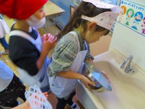 朝から皆で三角巾を付けて、お米を炊く準備👀