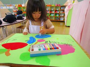 「チンアナゴ描きたい!」「丸い泡たくさん描こう!」「クラゲ可愛いでしょ~♪」など、お友達と楽しく話しながら、のびのびとお絵描きを楽しんでいました☆