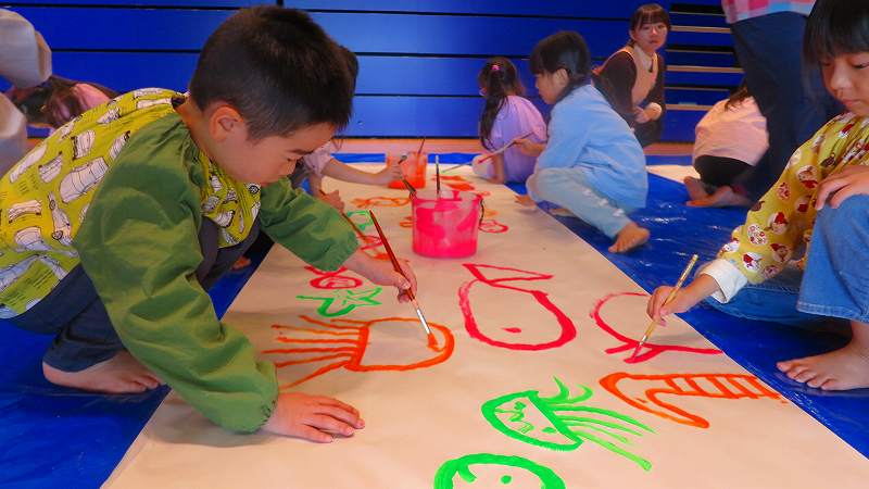 「チンアナゴ描きたい!」「丸い泡たくさん描こう!」「クラゲ可愛いでしょ~♪」など、お友達と楽しく話しながら、のびのびとお絵描きを楽しんでいました☆