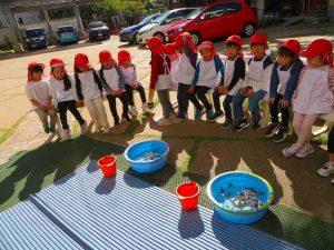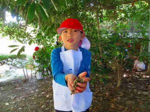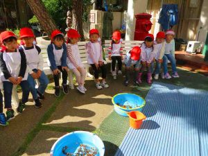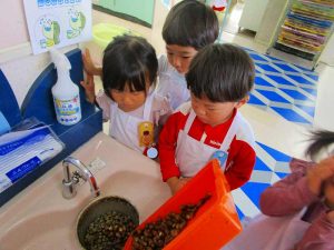 給食を食べ終わったら、みんなでどんぐりを水に浮かべて選別👀