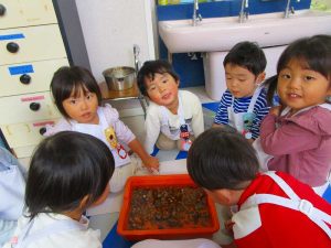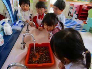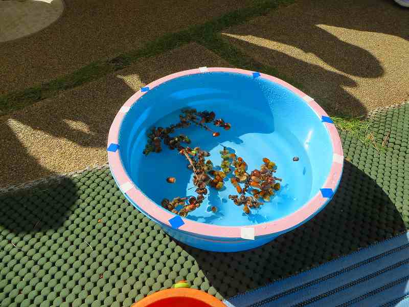 「浮いてきたのは、虫食いどんぐり?」「沈んだのは良いどんぐり!」