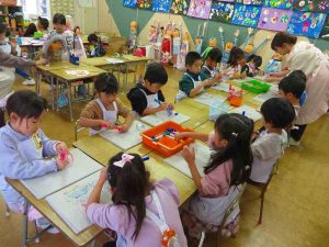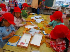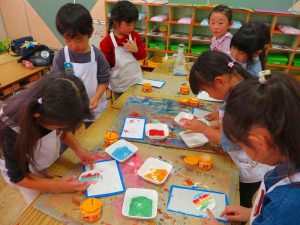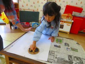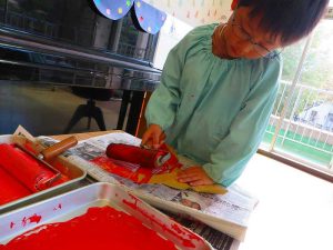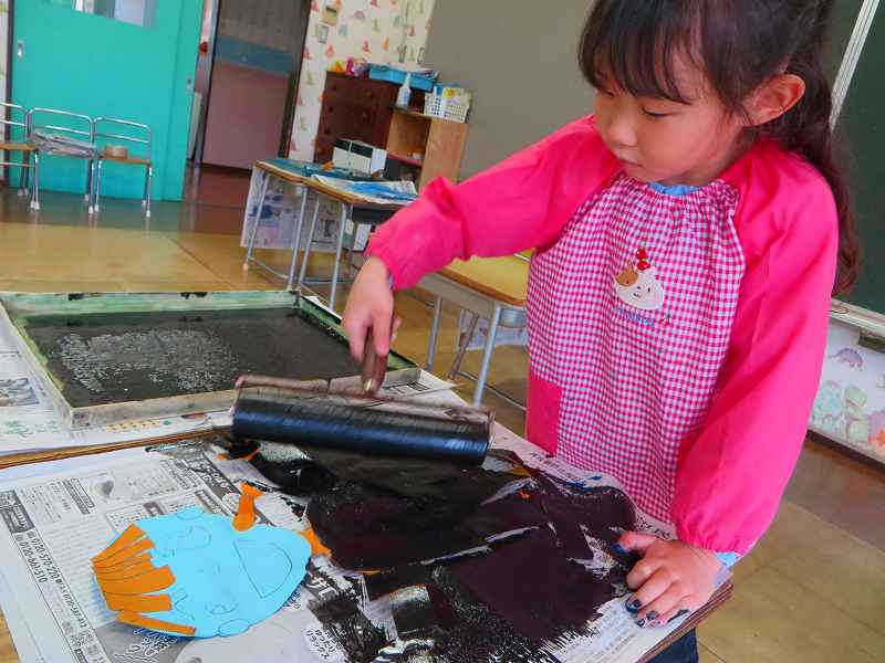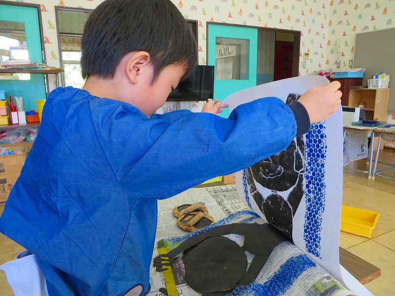 また、年長組さんは紙版画で「大好きな遊びをしている自分」、年中組さんは「大好きなどうぶつさん」を作っています。