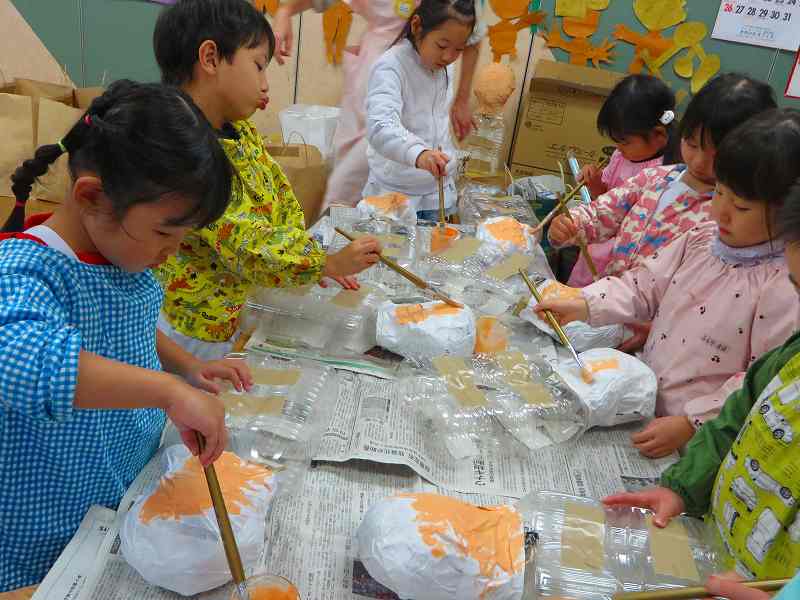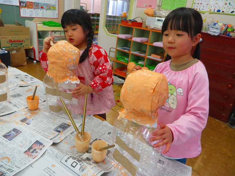 新聞紙を丸めて作ったお顔に絵の具で色を塗ったり・・・
