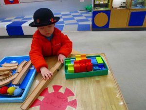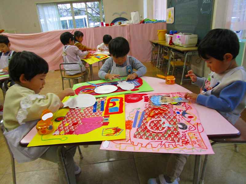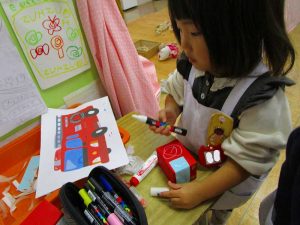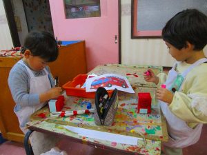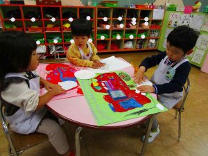 作品展の合同制作に飾った消防士さんになった自分を消防車のお絵描きにペッタン!合体したり…