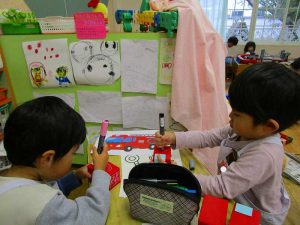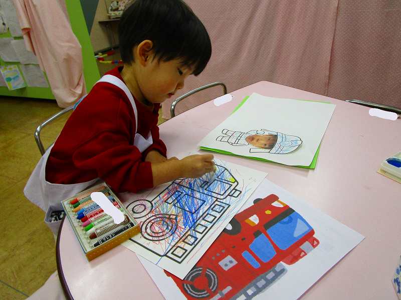 「消防車に乗ってるぼく・わたし描く~🎵」