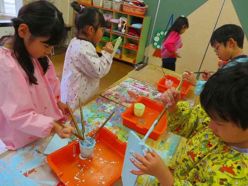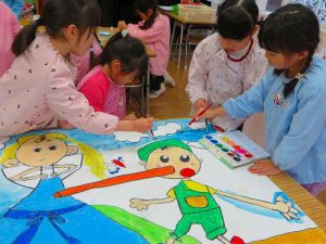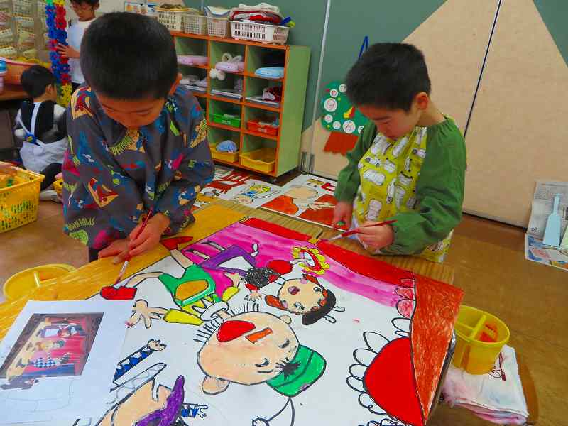 大型紙芝居の絵の具塗りをしたり・・・