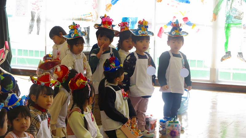 まずはどんな帽子や豆入れを作ったのか、見せ合いっこしましたよ♪