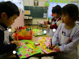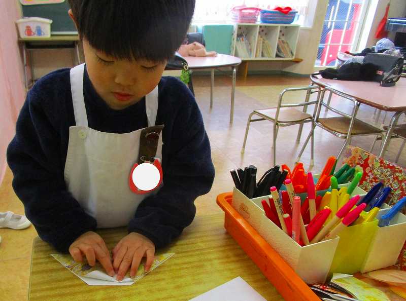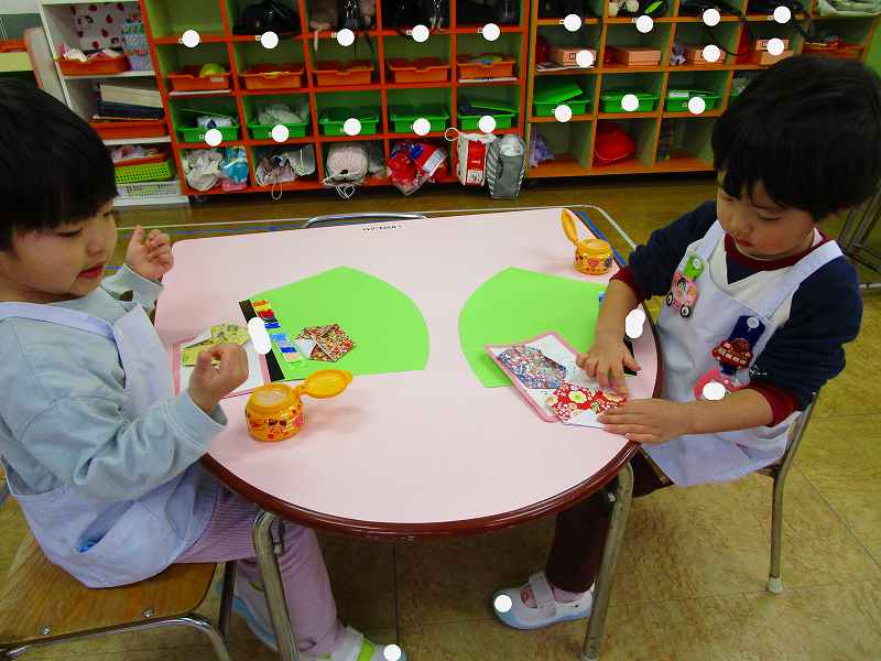 な~んてお話ししながらお顔を描いたり、着物を折ったり、座布団の色塗りをしたり笑