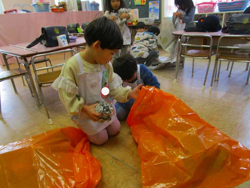 カラーポリ袋に新聞紙をつめつめ…何になるかはお楽しみです💖
